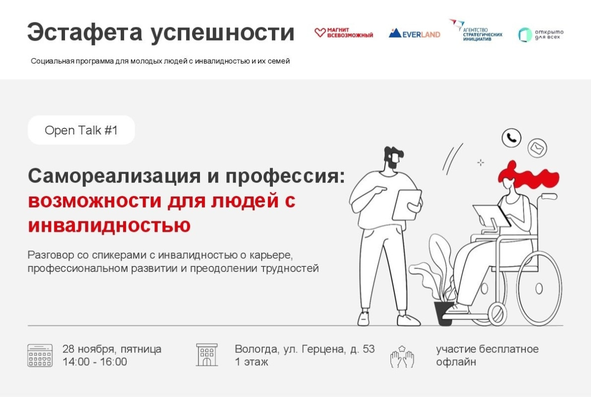 28 ноября в Вологде по адресу ул. Герцена, д. 53 состоится первое мероприятие в рамках Всероссийского инклюзивного форума «Открыто для всех» на тему «Самореализация и профессия: возможности для людей с инвалидностью».