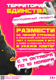 Всероссийский молодежный проект «Территория единства» проводится с 14 октября по 10 ноября. Инициатива реализуется в рамках празднования Дня народного единства. Участниками могут стать подростки и молодежь в возрасте от 14 до 35 лет, проживающие на территории РФ. Победителей объявят 11 ноября.