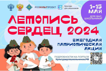 С 1 по 15 мая 2024 года в рамках межведомственного культурно-образовательного проекта «Культура для школьников» пройдет Всероссийская ежегодная патриотическая акция «Летопись сердец», которая в этом году посвящена детской литературе и кинофильмам для детей о Великой Отечественной войне.
