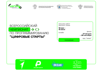 Российский детско-юношеский центр совместно с детским центром «Океан» проводят конкурс на участие в дополнительной общеразвивающей программе «Всероссийский чемпионат по программированию «Цифровые старты». Цель – поддержать участников, добившихся успехов в научной или информационно-технической деятельности.
